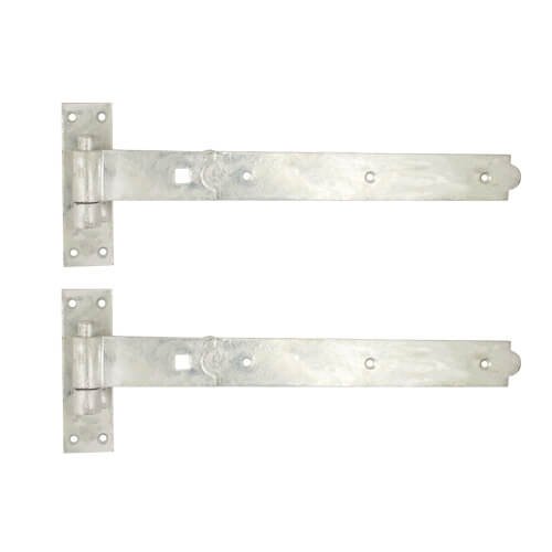 Crompton straight folded eye band with hook on plate. These traditional style hinges are ideally suited for use on gates and allow the gate to be lifted off in the open position, for cleaning or maintenance. Sold in pairs, these hinges are galvanised and suitable for use outdoors. These hinges measure 762mm in length.