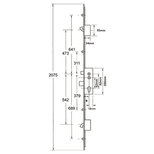 Centres are positioned at 62mm and 92mm with the top spindle being 122mm from the bottom of the case. Single spindle locks have a round hole where the second spindle would usually be located. The gearbox is pierced to accept a bolt through fixing 19mm from the top spindle, and the slot above for fixings is 42mm above the spindle.