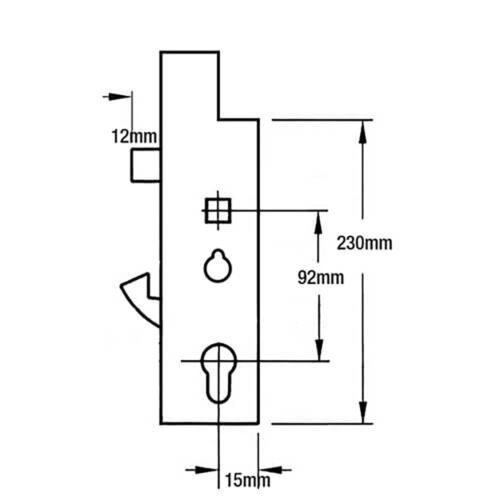 Fullex XL gearboxes are available in 35mm and 45mm backsets in single, double, and split spindle configurations but their dimensions are all the same. They measure 227mm high by the backset + 15mm. These gearboxes attach to their strips with three equidistant screws. The middle screw is 108mm from the top, which is also 108mm from the bottom screw.
