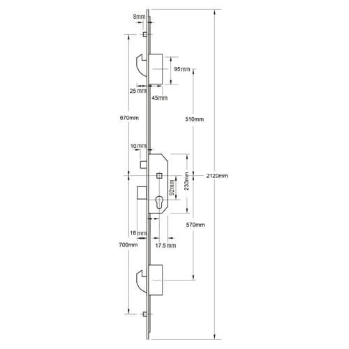 This Mila Barratt Homes multipoint door lock features 2 Rollers 2 Hooks & 1 Latch.