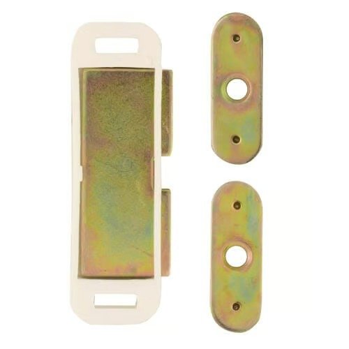 Twin magnetic catch which provides a simple and effective way to keep applications such as cupboard doors, lids and removable panels closed.