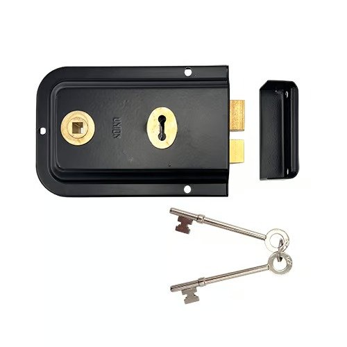The Union 1445 Rim Sashlock is a typical cost effective non handed Rim Sash lock with designed for use as a basic security surface mounted product in residential or light commercial environments. the 2 way key hole ensures the lock can be mounted either way up to prevent the need for any re handing, and the 2 extended length keys provided will reach through the thickness of the door from the outside. The 1445 features a bevelled edge and rounded corners.