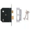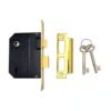 There are multiple types of lever lock in use in the UK. Dead locks (mortice dead locks) are operated by a key only whereas sash locks (mortice sash locks) feature a dead bolt and a latch which is operated by a handle (often a lever handle). Both lever locks with throw the dead bolt into a strike plate. The strike plate on sash locks also accepts the sprung loaded reversible latch.