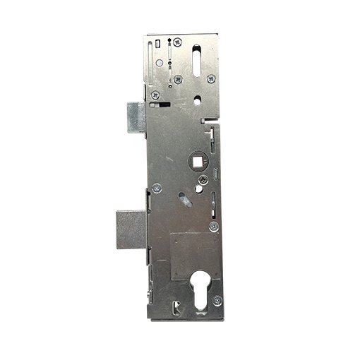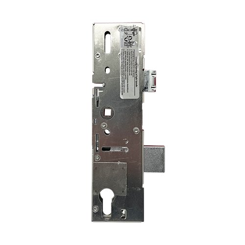 Westward multipoint door lock gearboxes feature a 24mm high latch (with 2 distinctive screws in the latch), a 30mm high deadbolt, and 61mm between them. Gearboxes are held on to the faceplate with 4 screws, which is unusual for a multipoint door lock. The first screw hole to the second measures 37mm, the second to the third measures 85mm, and the third to the fourth screw measures 43mm.